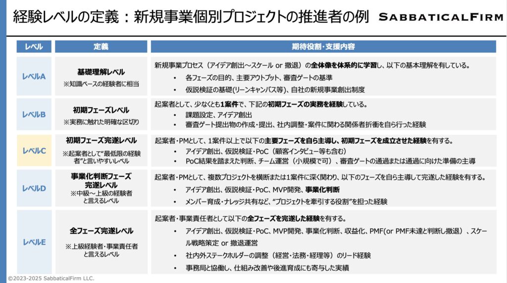 ・Level A(関心層): 新規事業の作法やフレームワークを研修等で学んでいる。